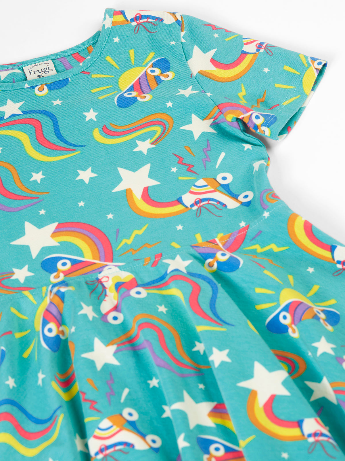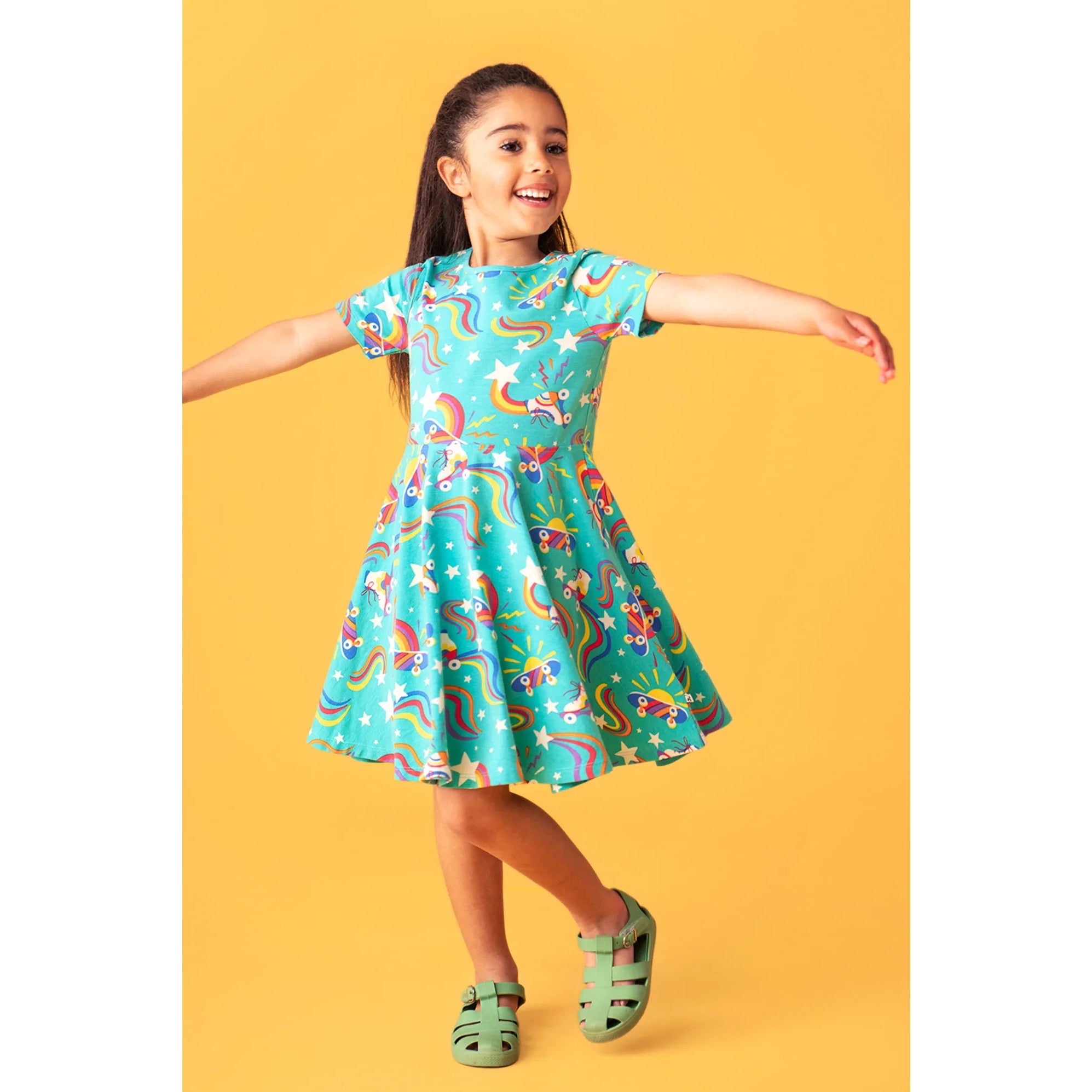 Always ready to boogie! This Frugi Sunshine Skater Dress is perfect for spinning, dancing, and twirling the day away. This GOTS certified dress has short sleeves, a full circular skirt, and comfy organic cotton elastane fabric, it’s soft, breathable, and ready to party!