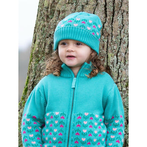 Kite Hygge hat in aqua blue features our super sweet jacquard detailing. Knitted with a soft fleece lining and turn up, this hat provides 'itch-free' comfort and is perfect for cold-weather adventures.