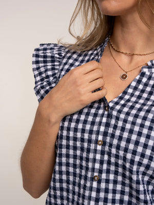 Navy and white gingham brings a classic summer feel to the Brakeburn Bia Blouse. Designed with a relaxed shape, it features a button-through notch neckline with soft ruffle detail and gently ruffled cap sleeves. Pair it with our Aitana Shorts or Teresa Dress for an easy summer outfit.