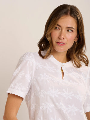 Holiday vibes, this Brakeburn Vanessa blouse has these in abundance. Soft white cotton with an all over palm tree embroidery design. Ruffled neck with key hole and mock mother of pearl button fastening, ruffles at the cuff with a button fastening.